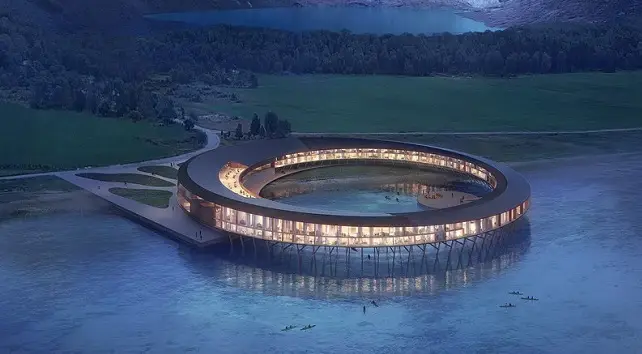 Het Six Senses Svart hotel in Noorwegen, ontworpen door Snøhetta en gelegen in de Holandsfjorden bij de Svartisen-gletsjer, wordt ‘s werelds eerste energiepositieve hotel. et ronde, futuristische ontwerp, ook wel “ruimteschip op palen” genoemd, is geïnspireerd op traditionele Noorse vissershutten (fiskehjell). Het biedt 360-graden uitzicht over het fjord en de gletsjer.