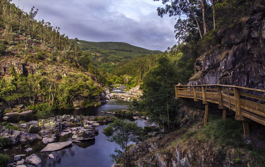 Bij het binnenrijden van het laatste park maken we een bijzondere lus waar het voelt alsof we letterlijk door de tijd reizen. We passeren historische graanschuren – espigueiros en rijden langs de indrukwekkende Cascata do Arado – een waterval met een smaragdgroen heldere laguna.  Dit deel behoort tot de sportieve variant en heeft geen officiële naam – maar qua karakter en intensiteit zou hij moeiteloos de Great Waterfall Road kunnen heten. Tussendoor stuurt u door een bijna ongerept oerbos waar met mos begroeide boomstammen dicht langs de weg staan. Het licht filtert door het bladerdak terwijl de motor weerkaatst tussen grote rotsblokken en groen (zie  fotocarrousel).